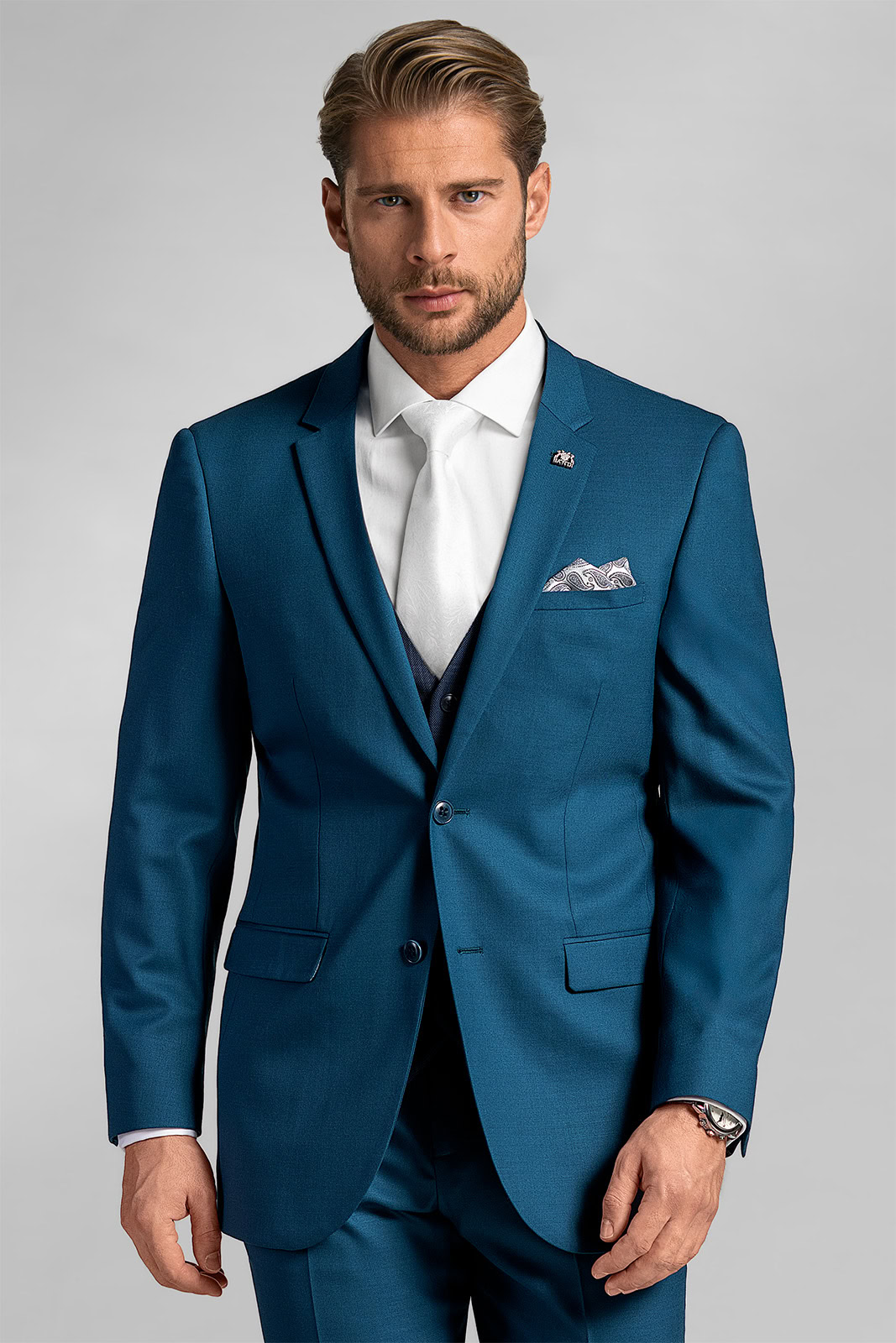 Keď ide o vašu svadbu, nerozhodujte sa medzi dokonalým vzhľadom a pohodlím. Vyskúšajte neobmedzené možnosti kombinovateľného obleku Martucio Blu. Užite si jeho noblesu a mimoriadny komfort. Vlnený model s jemným vzorom vyniká výnimočnou eleganciou, hravosťou a originalitou.