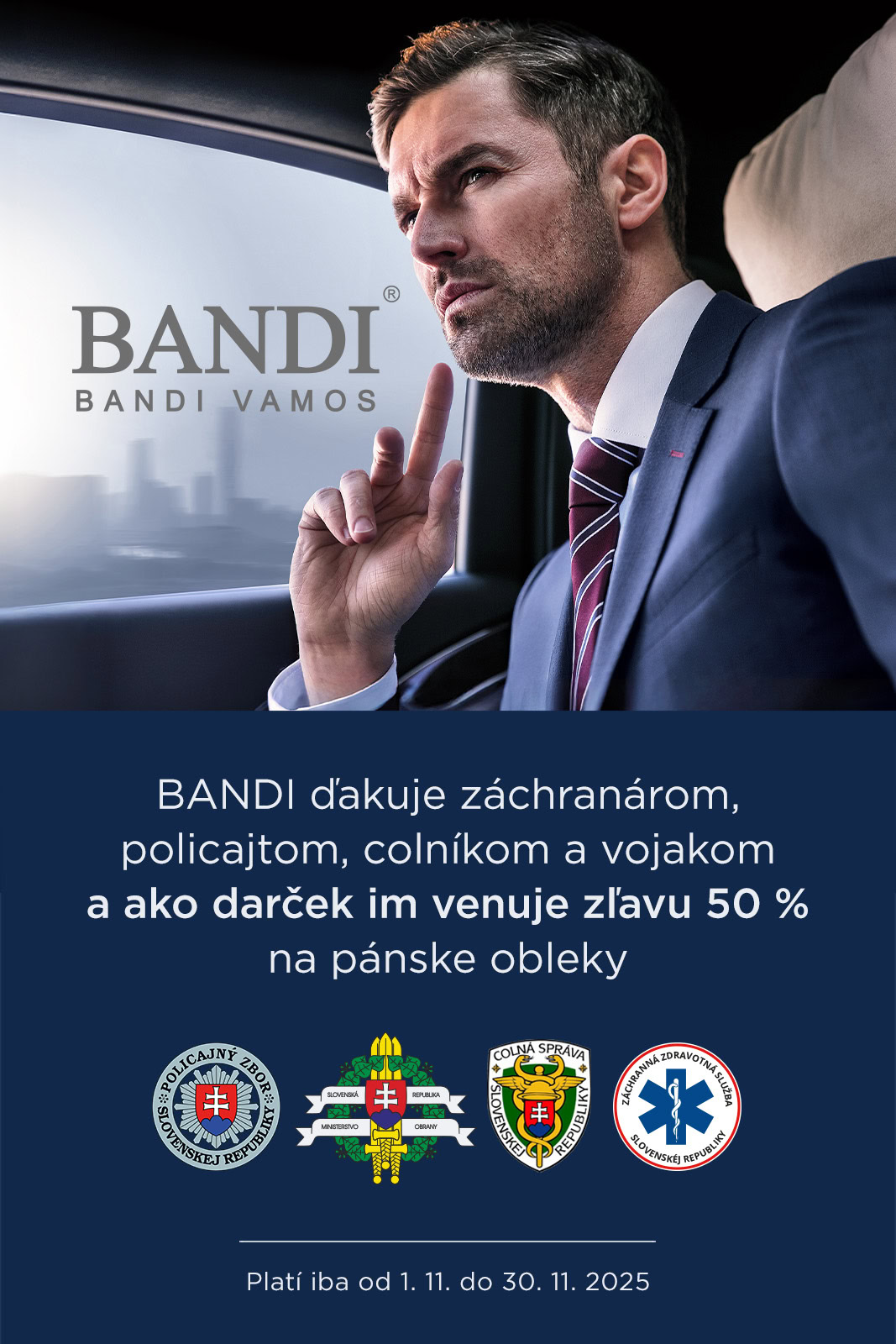 Príslušníci, členovia a zamestnanci zložiek IZS a Ozbrojených síl SR majú možnosť využiť tento darček a nakúpiť od soboty, 1. novembra, do stredy, 31. decembra 2025, vo všetkých značkových predajniach BANDI vybrané modely pánskych oblekov s mimoriadnou zľavou 50 %.