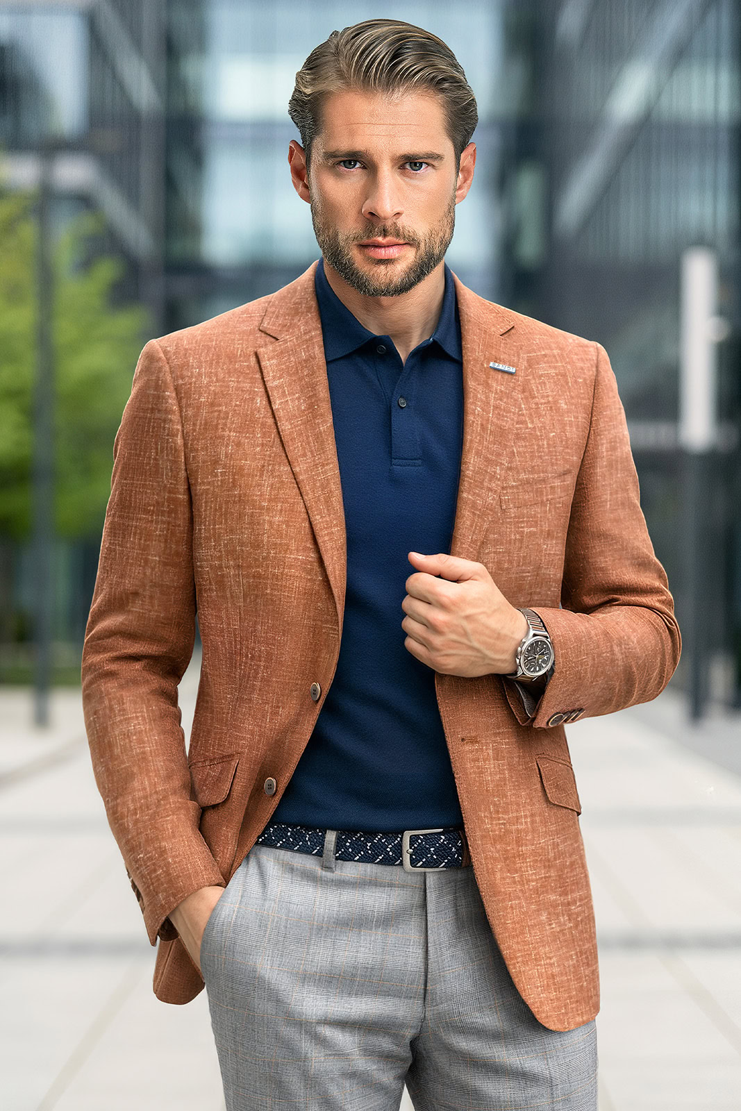 Škoricovohnedé ľahké sako s decentnou textúrou, kárované svetlosivé nohavice a tmavomodré polotričko. To je zaručený recept na štýlový outfit do uvoľnenej kancelárie alebo na osobné stretnutie s klientom. Vychutnajte si mimoriadny komfort a nechajte svoju charizmu vyniknúť.