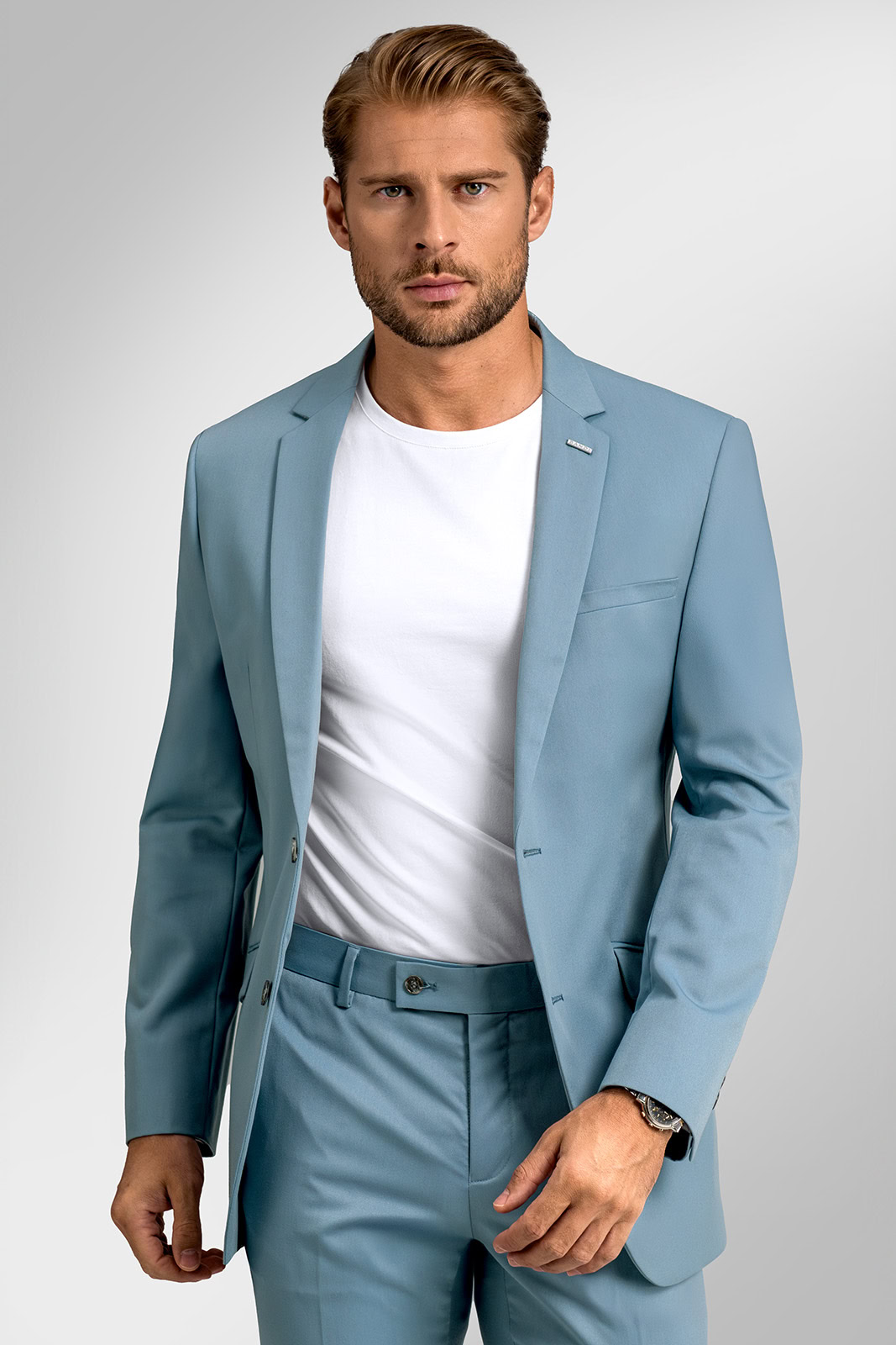 Svetlomodrý oblek BANDI Estatio farby nebeskej modrej dodá vašim jarným outfitom výnimočnú eleganciu a sviežosť. Odľahčite ho bielym tričkom a dolaďte ručne šitými koženými teniskami. Nakombinujete si tak štýlovo uvoľnené oblečenie do práce aj na neformálnu obchodnú schôdzku.
